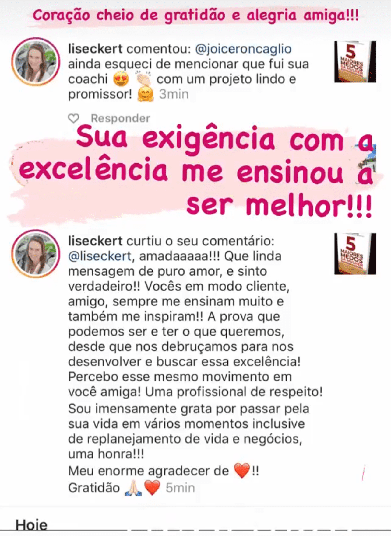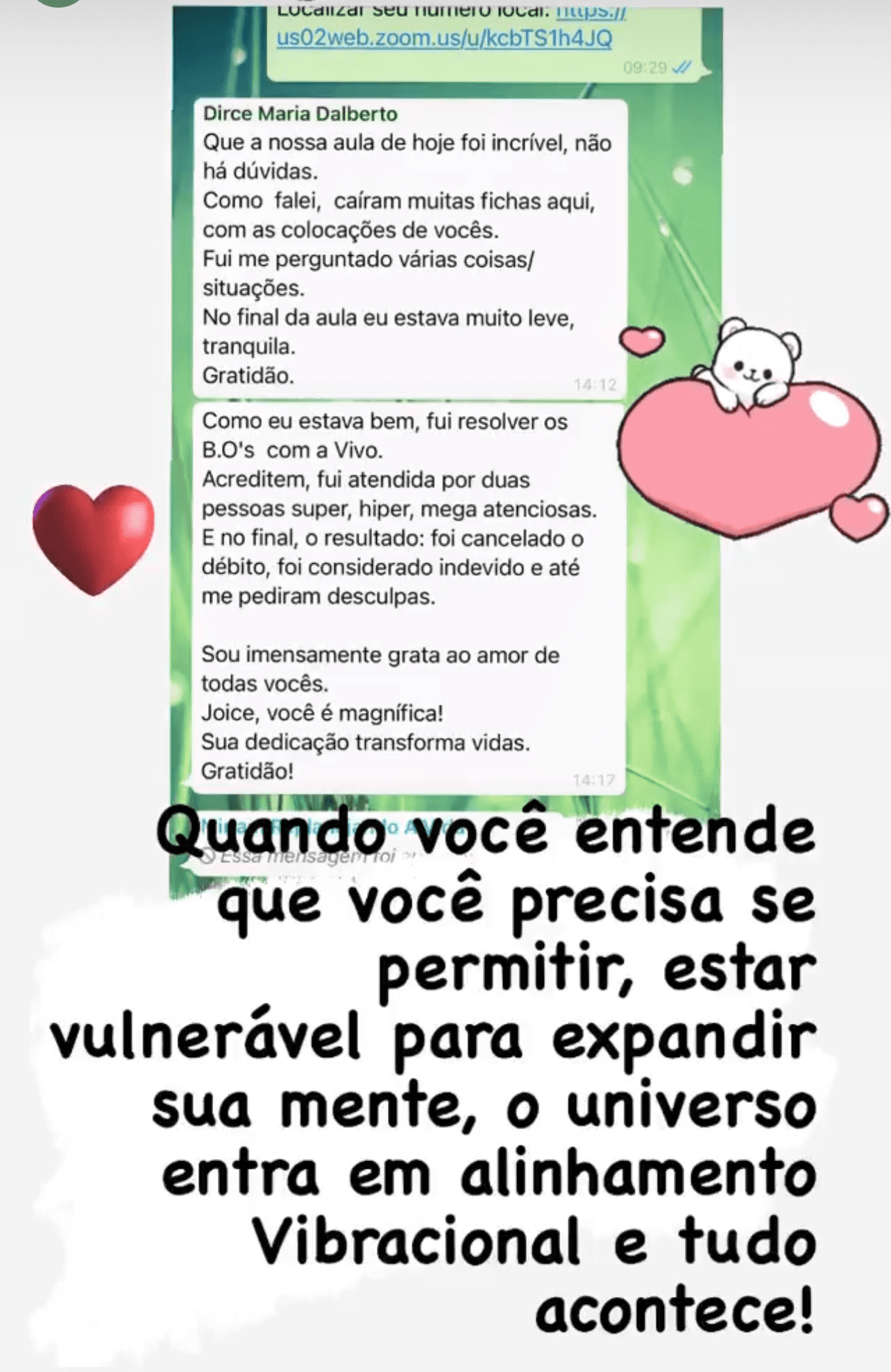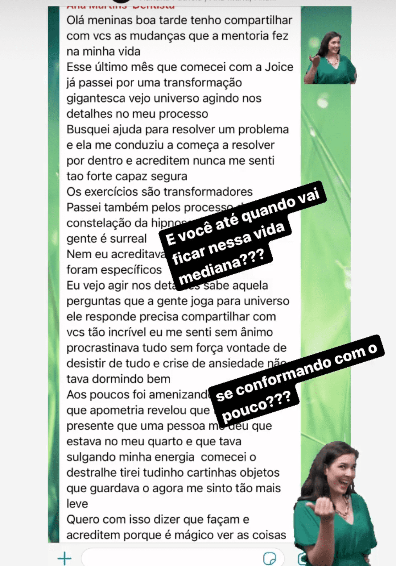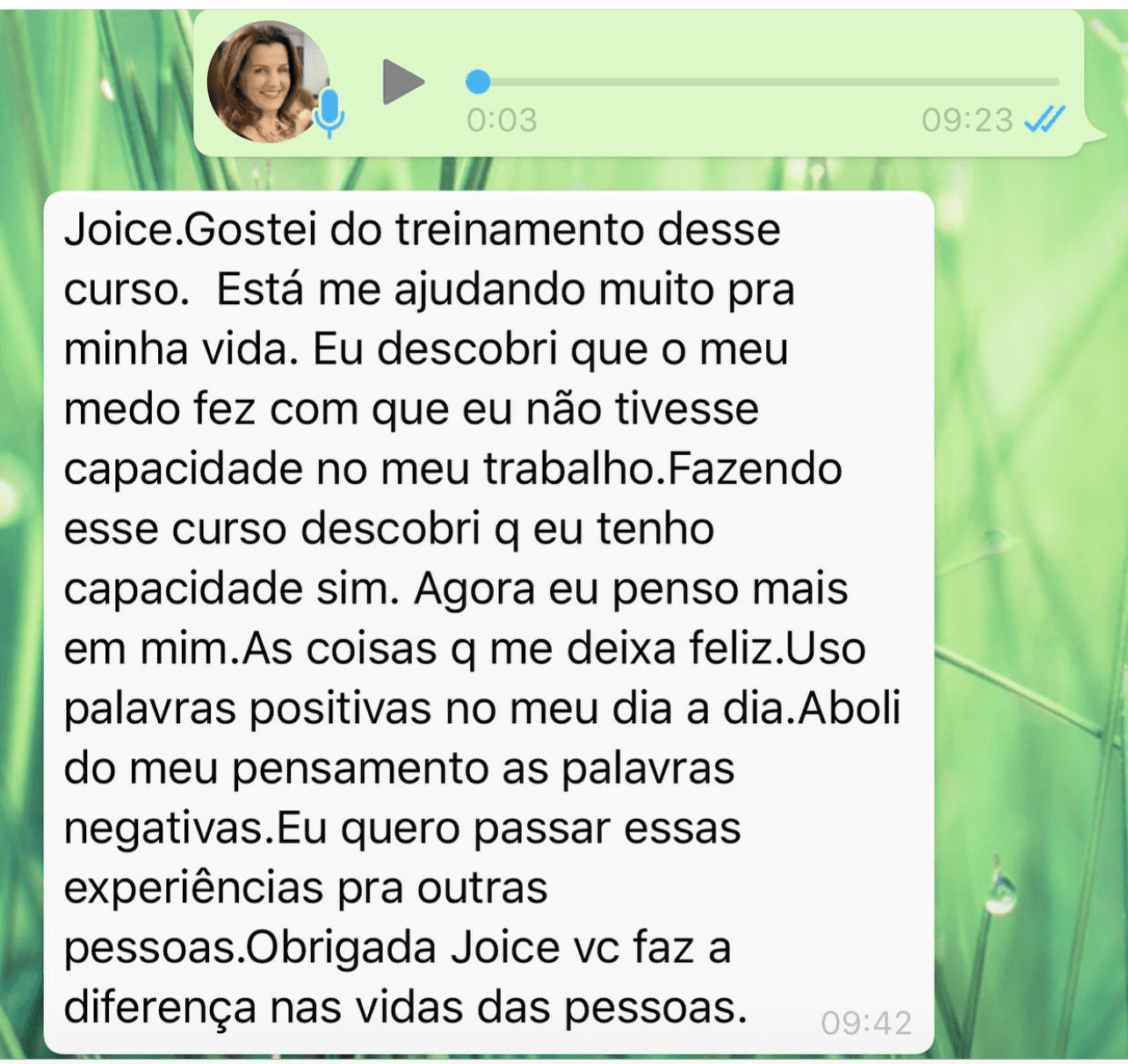 Oi, eu sou a Joice, mulher, mãe de três. Avó de 3 meninas. Saí de uma mente de escassez, perdida, sem organização das ideias, sem rotina saudável produtiva, vivendo uma vida que não era a minha e com resultados medianos, para uma empresária de sucesso e com uma vida abundante, próspera, resultados financeiros incríveis e de forma leve, com tempo para a minha própria pessoa que isso era raro.